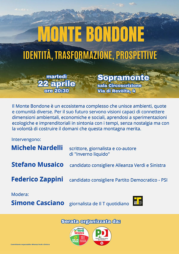 Martedì 22  alle  20.30 – INCONTRO SUL BONDONE – Sopramonte – sala Circoscrizione – via di Revòlta, 4.