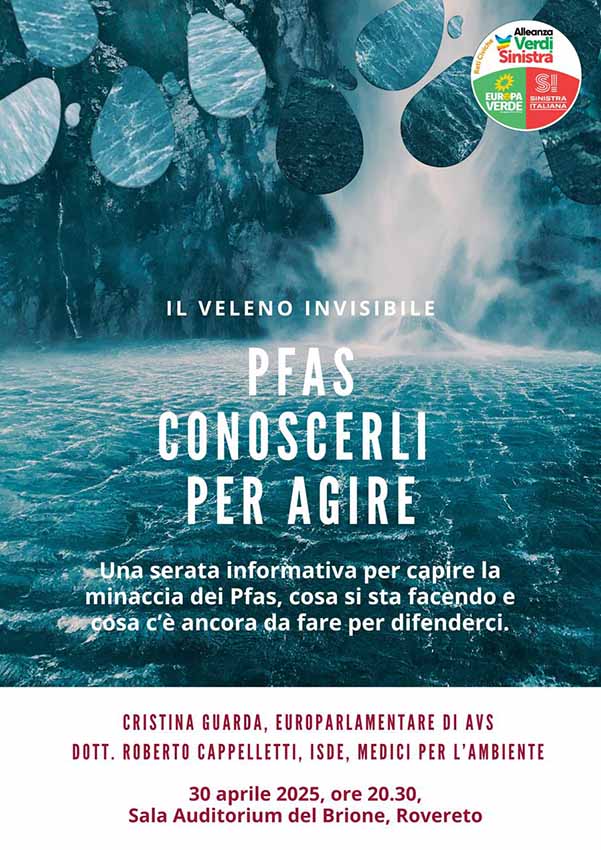 Mercoledì 30 aprile alle ore 20.30 – PFAS: CONOSCERLI PER AGIRE – con Cristina Guarda – Sala Auditorium del Brione – ROVERETO