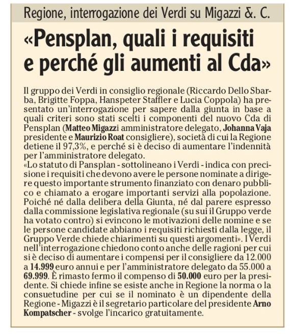 REGIONE, INTERROGAZIONE DEI VERDI SU MIGAZZI & C