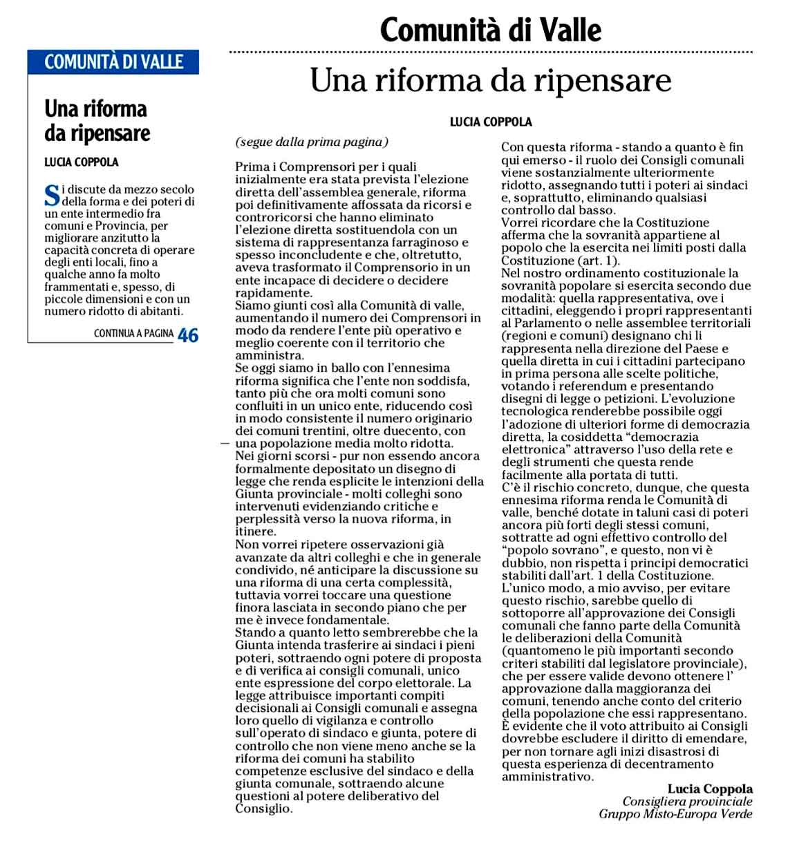 di Lucia Coppola, Consigliera provinciale