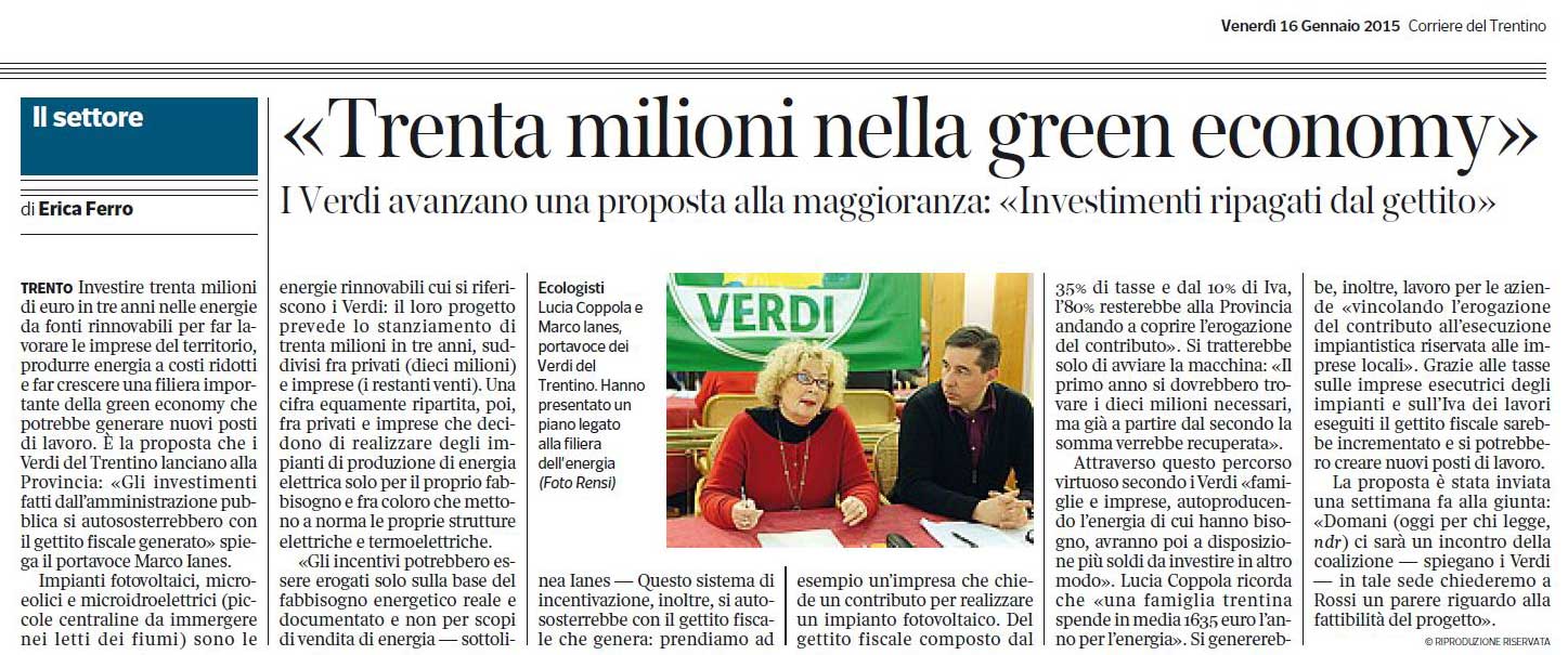 I Verdi del Trentino propongono alla Giunta provinciale di incentivare con 30 milioni di euro la realizzazione di impianti di produzione di energia elettrica a partire da fonti rinnovabili, con particolare riferimento agli impianti fotovoltaici, agli impianti micro eolici ed agli impianti micro idroelettrici. Secondo i co-portavoce Marco Ianes e Lucia Coppola la strutturazione di un percorso di finanziamento a progetti di approvvigionamento energetico per imprese e famiglie sarebbe in grado di «riaccendere» l'economia.